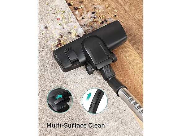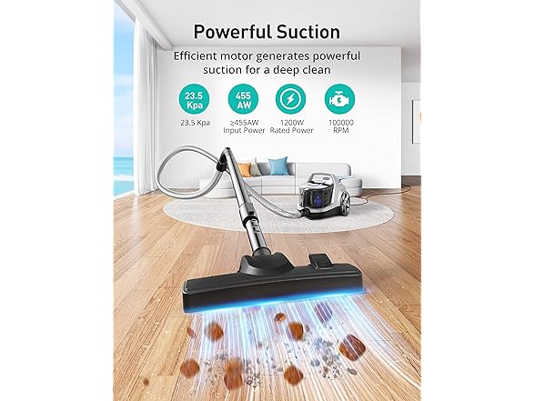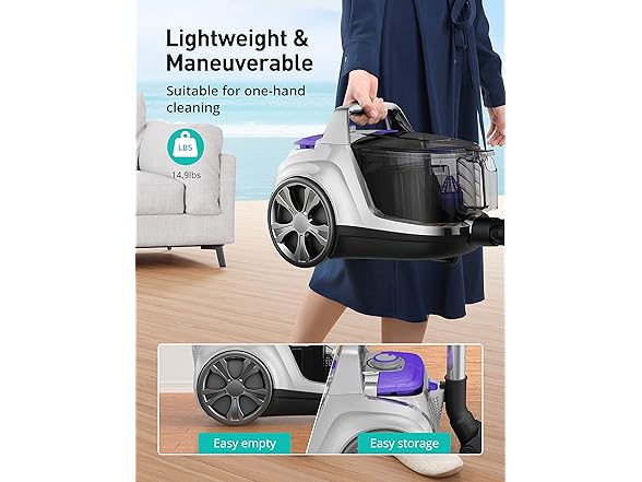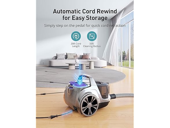 The canister vacuum cleaner boasts an exceptionally wide 33-foot cleaning radius thanks to its 20-foot extra-long cord with automatic rewind.
