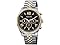 A sleek tonal scheme defines a classy watch featuring luminous markers and hands framed by a textured bezel and set on a fine bracelet. The Swiss quartz multifunction movement displays the day, date, and GMT.