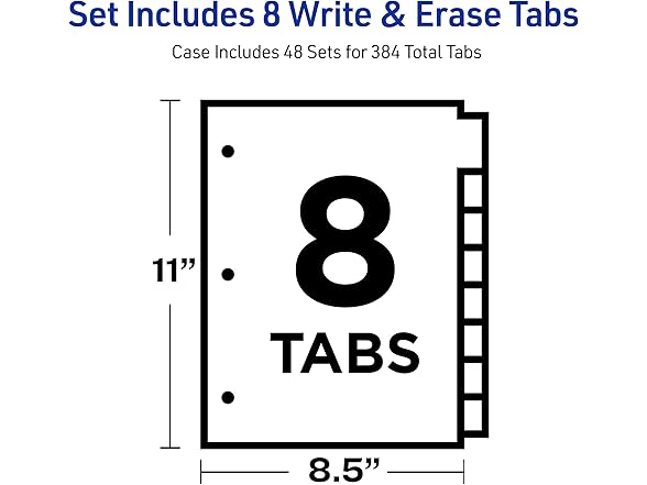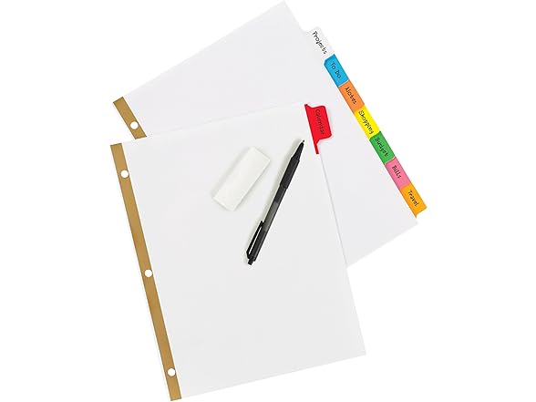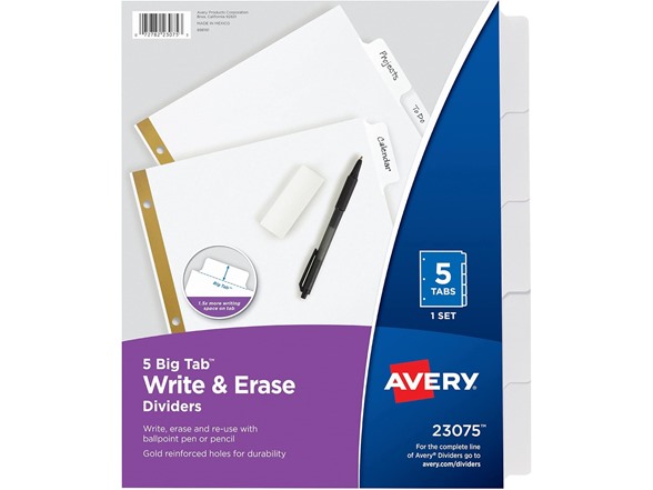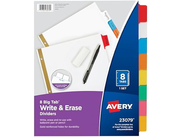 Stay organized and flexible with Avery 23079 Big Tab Write & Erase 8-Tab Dividers for 3 Ring Binders, designed for easy updates on the go. These sturdy paper dividers allow you to write, erase, and reuse as often as needed, giving you the flexibility to make changes at any time. Simply write directly on the tabs with a ballpoint pen or pencil, then erase whenever you need to revise or update. Plus, the Big Tab design provides 1.5 times more writing space than standard binder tabs, allowing you to use larger fonts or add extra information for easy visibility and organization. Perfect for school, home, or office use, each binder divider features brightly colored tabs for easy color-coding and quick referencing. Built for durability, the gold-reinforced binding edge offers maximum tear resistance at binder holes, ensuring long-lasting use in any standard 3-ring binder. Whether you're organizing school projects, work documents, or personal files at home, these 3 ring dividers with tabs are designed to handle everyday use. Perfect for busy professionals, students, or anyone looking to stay organized, Avery Write & Erase tab dividers make organizing and updating your binders easy and efficient.