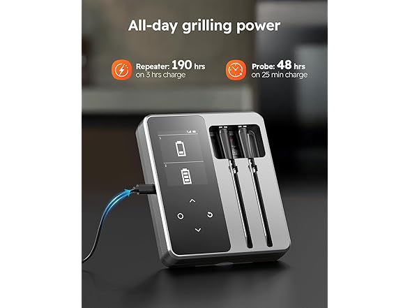 - Powerful Battery Life for Long Sessions: Keep the action going with an impressive battery life that supports long cooking sessions. Repeaters can run for 190 hours on a 3-hour charge and probe can run for 48 hours on a 25 min charge. No more interruptions-this thermometer is ready for extended grilling marathons