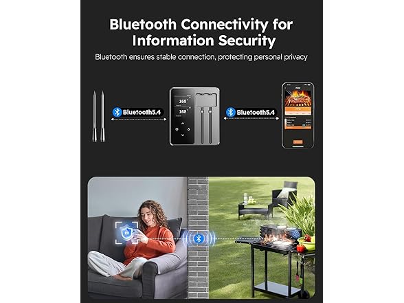 - Bluetooth Connection Protects Privacy: Stay connected and secure with advanced Bluetooth5.4 technology that ensures stable data transmission without compromising your privacy. Enjoy a smooth grilling experience with no drop-offs or interruptions