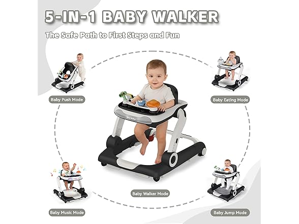 - 5-in-1 Baby Walker: Baby walker can be easily converted into 5 modes, including baby walker mode, bouncer combo mode, rocker mode, eating Table mode, hand push mode. Baby walker to meet the needs of different stages of baby's exploration, growth and baby up together, suitable for 6-18 months baby.