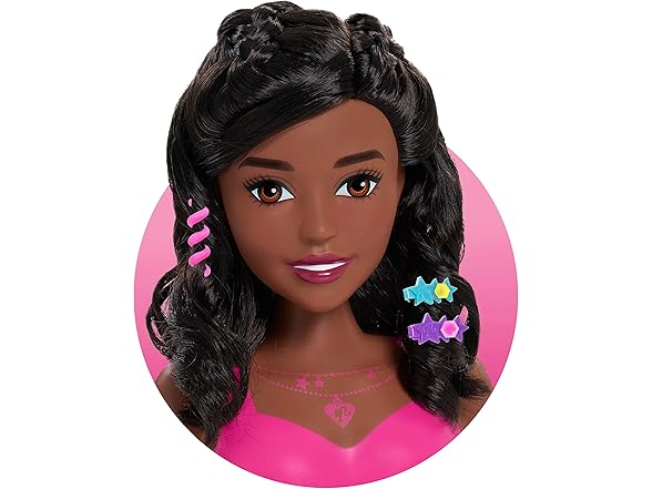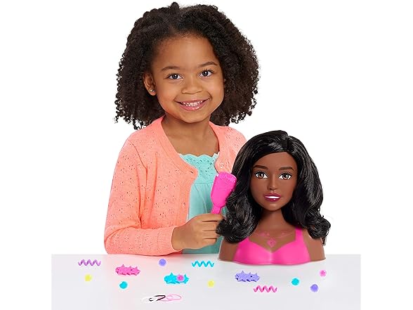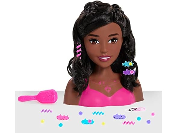 The Barbie Fashionistas Styling head is full of styling fun! Barbie's thick flowing hair is perfect for brushing, twisting, and pinning into trendy designs! Use the cute barrettes and hair ties to give Barbie a fancy up-do. For a more polished look, brush Barbie's hair back with the cute pink brush and use the hair twists to fashion her locks into a sleek top bun! You can even customize the hair barrettes with a variety of pop-in gems! With your help, Barbie will be the most stylish girl in town! Full set includes: One Barbie Styling Head, three customizable barrettes, seven pop-in gems, three hair twists, hair bands, and one brush. Ages 3+