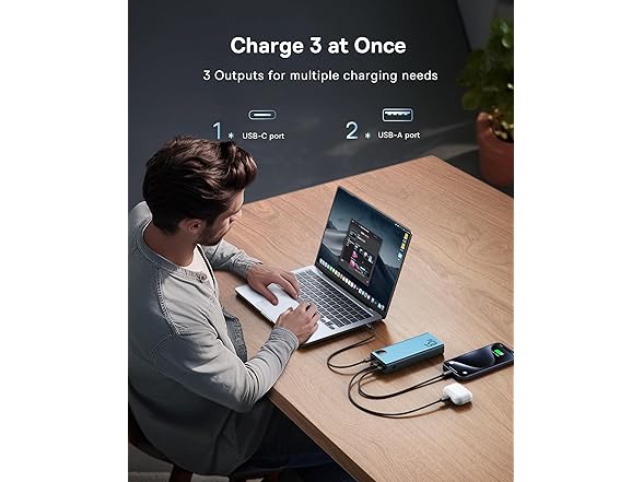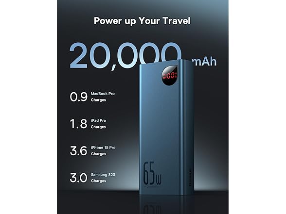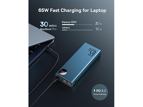 - 🏆️【Simultaneous 3-Device Charge 】Baseus portable phone charger equipped with one 65W PD USB-C port and two 30W QC USB-A port to ensure you can charge your laptop and phone at top speeds simultaneously. (Note: Simultaneous charging may affect charging speed.)