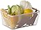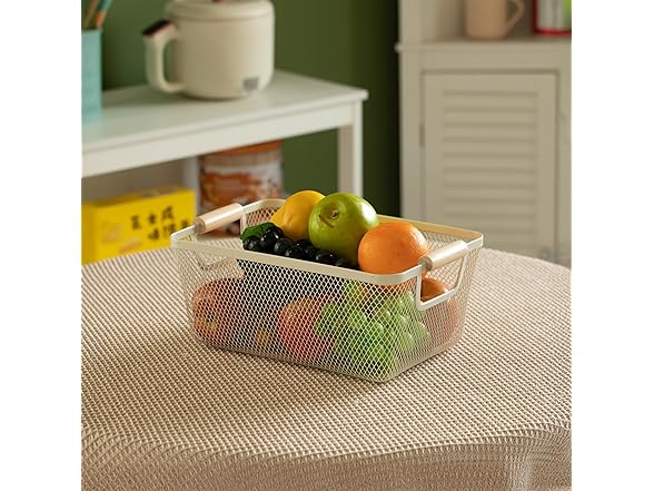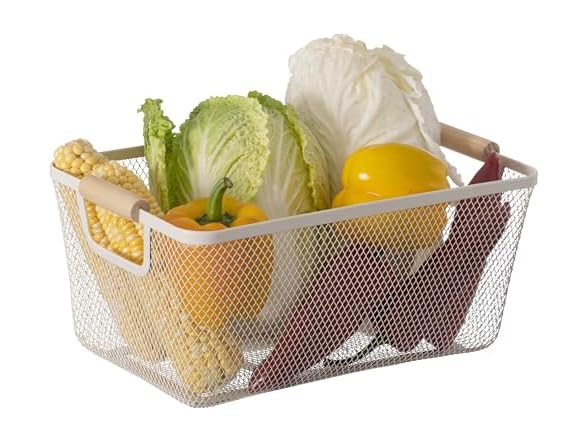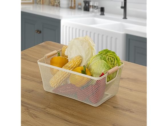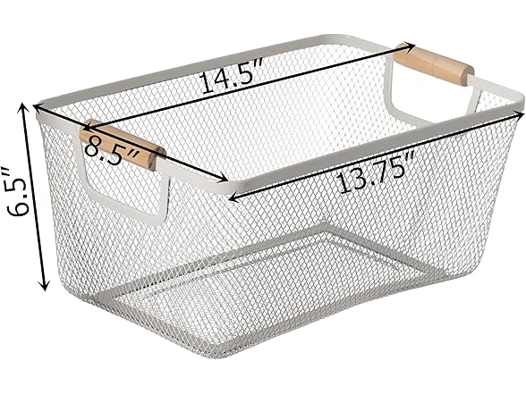 - Basket Dimensions: 14.5" W x 8.5" L x 6.5" H. Crafted from metal mesh with a smooth, perforated interior that helps prevent bruising of fruits and vegetables. Ideal for rinsing and keeping produce fresh, this basket also brings a decorative touch to your kitchen or dining area with its charming wooden handle and clean, airy design—a perfect blend of function and style.