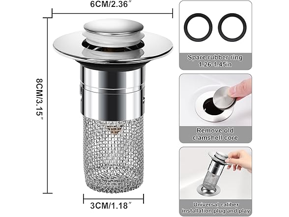 【Applicable Size】Fits wash basins, bathroom sinks and shower basins with an inside diameter of 1.26 to 1.45 inches. Bathroom Sink Drain Strainer Includes two sizes of rubber rings (34 mm and 40 mm) to ensure a snug fit for different sized drains. 【Excellent Material, Feel Free To Use】The Universal pop-up sink drain filter is mainly made of stainless steel materials and thickened copper materials,Drain Plug Bathroom Sinks are brass core construction that ensures durability and longevity, rust-proof and reliable 【Filtering Of Foreign Matter To Minimize Clogging】The sink drain plug has a bullet core thrust shape and is designed with a built-in clogging basket that catches hair and other debris and prevents them from entering the drain. This helps maintain efficient drainage, prevent clogging problems, and keep your sink clean and functional. 【Easy To Install And Simple To Clean】Bathroom Sink Drain Stopper is no need for a complicated process, simply remove the old drain plug from the sink and insert our Bathroom Sink Drain Strainer for improved drainage and anti-clogging performance. To clean, simply rinse with tap water and remove stubborn debris with a soft brush or soft cloth.