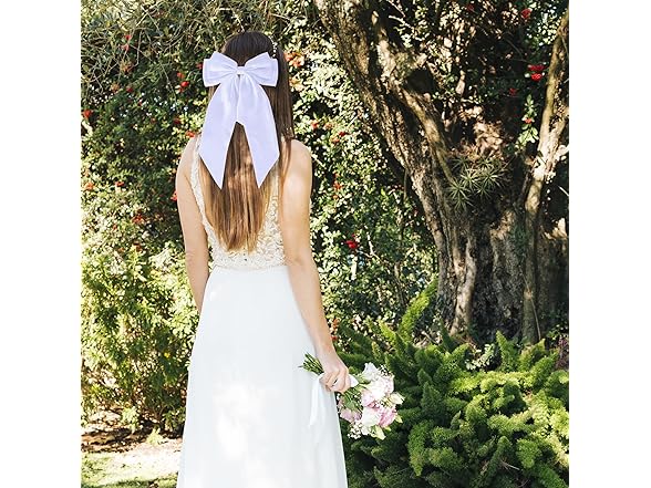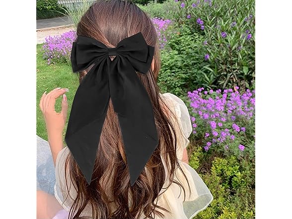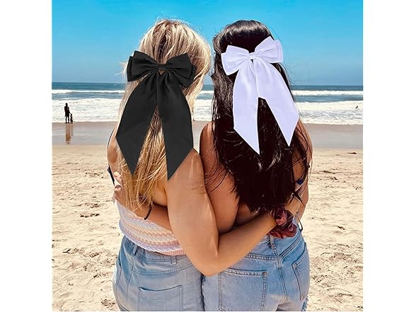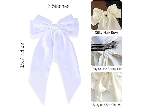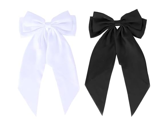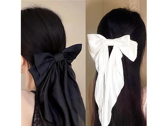 Oversized French Bows Hair Accessories: Silky Satin Barrettes with Long Tails, Metal Clips for Women - 2Pcs Set, White and Black