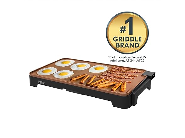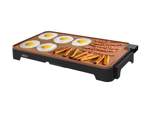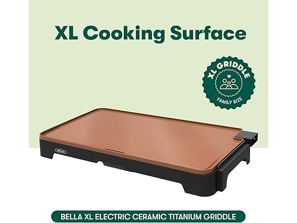 In the Box: (1) bella XL Electric Ceramic Titanium Griddle, Make 15 Eggs At Once, Healthy-Eco Non-stick Coating, Hassle-Free Clean Up, Large Submersible Cooking Surface, 12" x 22", Copper/Black