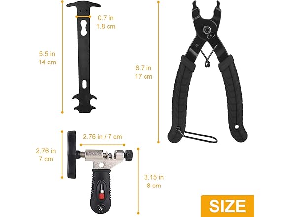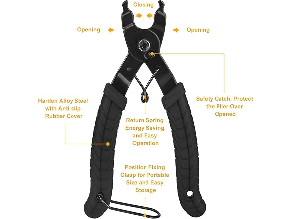 - Bike Link Pliers --- It is chain master link remover and connector, works for all chains and connectors. The anti-slip handles and middle spring help to control the pliers easily. There is safety pin protect from over opening and a clasp on the bottom help for collecting two handles for storage.