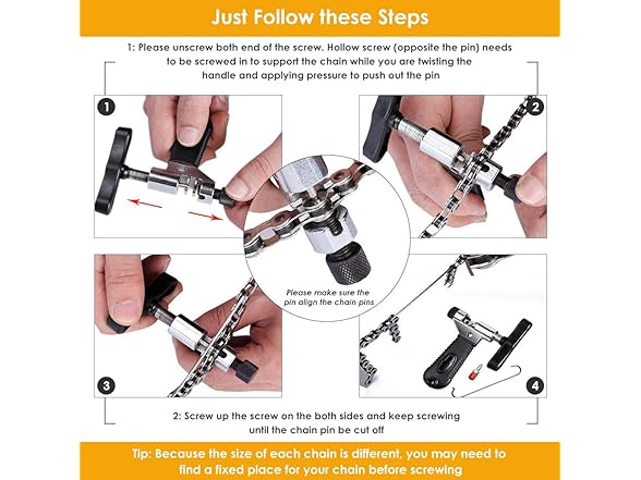 - Bike Chain Breaker Splitter with Chain Hook --- The chain breaker splitter is designed to remove and install pins to change the worn chain. Accompanying iron hook could help to hold the chain sturdily, to prevent the chain springing and hurting bikers. With a replacement thimble build-in handle, which could be used to replace in case of the original thimble damage by improper operation. Metal frame ensures the strength and durability, rubber handle offer comfortable and anti-slip grip.