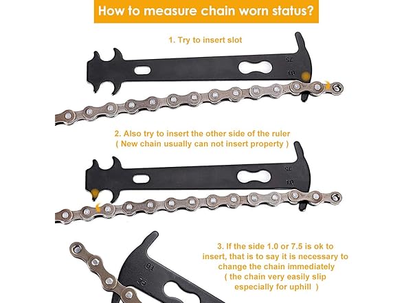 - Bike Chain Checker --- When the chain need to be replaced? Use this checker to measure the state of your chain. It is possible to measure broken chains at any time. If the 0.75 or 1.0 tooth will pass all the way through bike chain, which means it is worn and must be replaced immediately.
