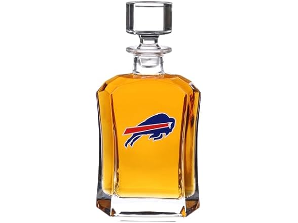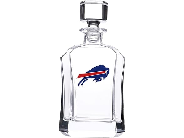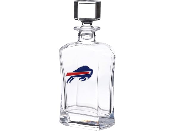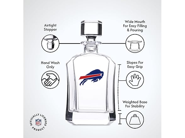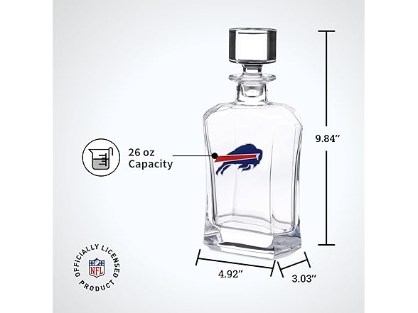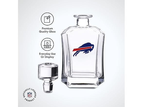 - OFFICIALLY LICENSED NFL MERCHANDISE:. Elevate your barware collection with this premium 26oz glass decanter, featuring your favorite NFL team logo and emblem. A must have for football fans, this decanter adds a sophisticated touch to any home bar, office, or man cave.