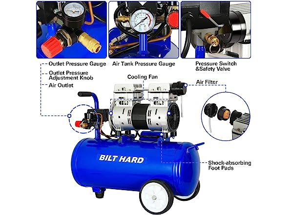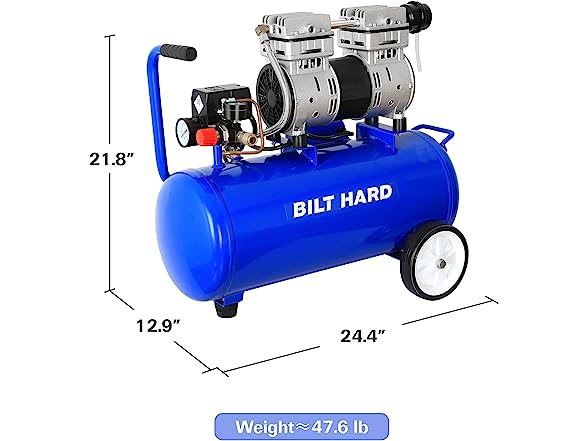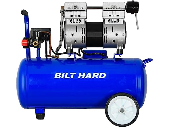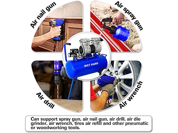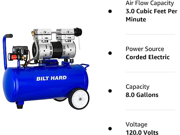 - High Capacity: The Quiet Air Compressor features an impressive 8-gallon steel tank, providing ample air storage capacity. This large tank ensures a steady air supply, allowing you to tackle extended tasks without interruptions.
