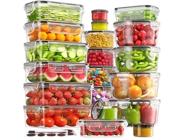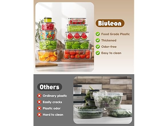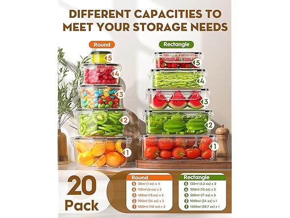 - 【Versatile Size Airtight Containers】BiuLeon 20 pack airtight food storage containers includes 8 pack rectangular containers(50.7, 34, 17, 10, 4.2oz), 12 pack round containers(40, 24, 13, 6, 4oz). Sizes ranging from large to small, whether it's leftovers, soup, snacks, or sauces, they can all be easily stored and kept fresh.