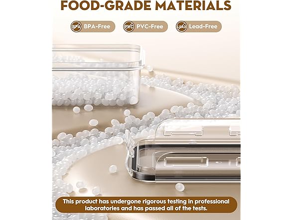 - (This product has undergone rigorous material testing in professional US laboratories and has passed all of the tests.) Entire food storage containers with lids set is made of PP-5 (Polypropylene-5) material among plastics. The characteristics of this material are that it can be used as food grade, transparent, odorless, BPA-free, PVC-free, lead-free, has excellent stability, and can be reused for a long time.