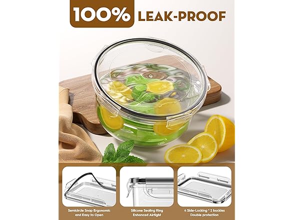 - 【100% Leak Proof】Airtight food container with lids are protected by high quality food-grade silicone seal ring and 4 side latches, double protection ensures excellent sealing and leakage prevention. so you don't have to worry about liquid leakage even during vigorous shaking.