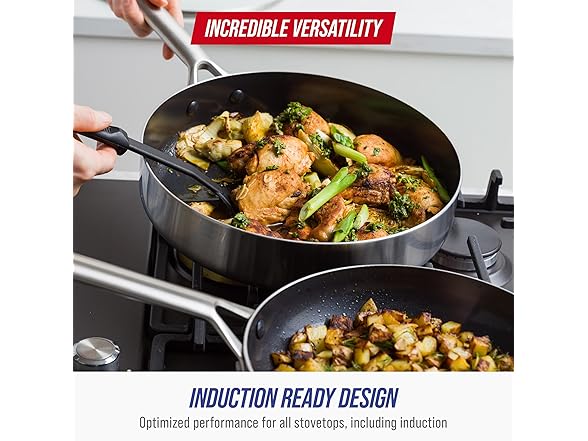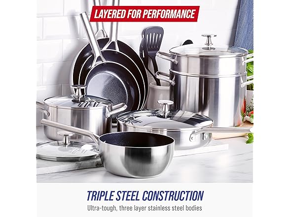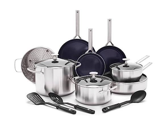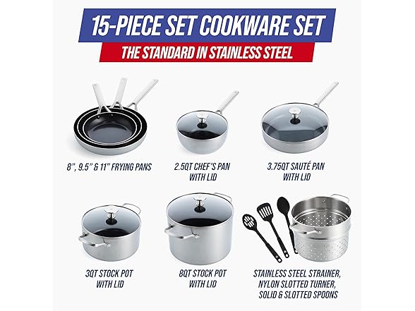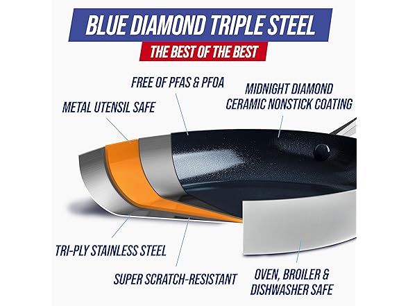Blue Diamond 15 Piece Stainless Steel Tri-Ply Cookware Pots and Pans Set, Induction Compatible, Diamond Infused PFAS-Free Ceramic Nonstick, Dishwasher & Metal Utensil Safe, Scratch Resistant, Silver