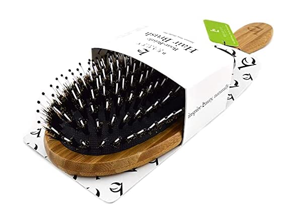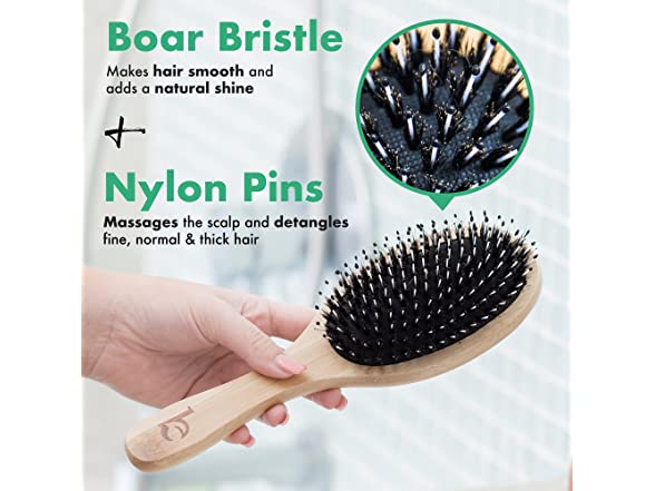 - ECO-FRIENDLY BAMBOO PADDLE BRUSH: This oval paddle brush is a good medium sized brush made of quality sustainable bamboo. The wooden brush has boar hair and nylon pins for tear-free brushing.