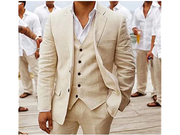 - ️ The 3 pieces suit set for men beach wedding is made from light weight linen,vest with 2 fake decorative pockets design.