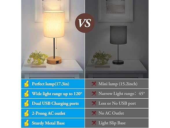 - 【USB Ports and AC Outlet For Convenient Charging】This stylish table lamp has two USB ports and one ac outlet, You can charge your Phone, blue-tooth speaker, Kindle Reader, Power Bank or any other electronic devices, regardless of whether the lamps is on or off. Great design to save you from the trouble of not having enough wall sockets to charge multiple devices at the same time. Make your life more convenient.
