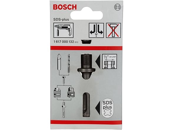 In the Box:- (1) Bosch SDS-Plus Chuck Adapter (for Drill Chuck, 1/2 inch - 20 UNF, Accessories for Rotary Hammers and Drills)