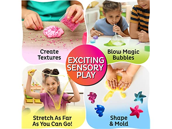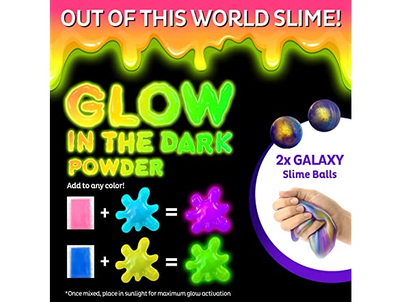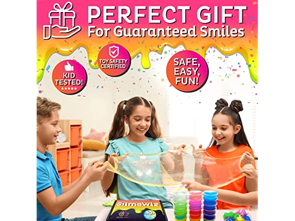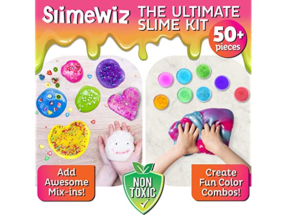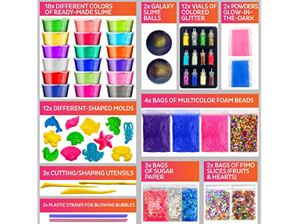- Another Dimension? Yes, it’s possible! - Make your own slime galaxy and create slimy adventures with our exciting SlimeWiz Kit. The kit features over 50 irresistible crystal slimes and accessories for endless hours of gooey, squeezable fun! Includes 18 colored and clear slimes plus 2 galaxy slime balls, all of them premade and ready to pull, shape, or decorate with all our fun extras!