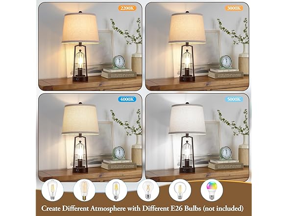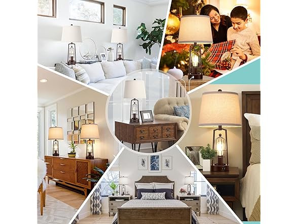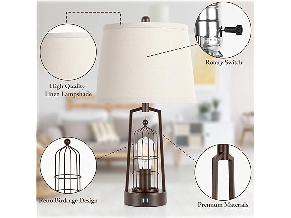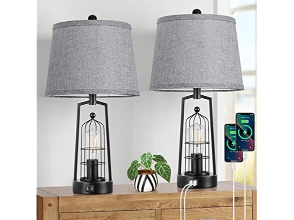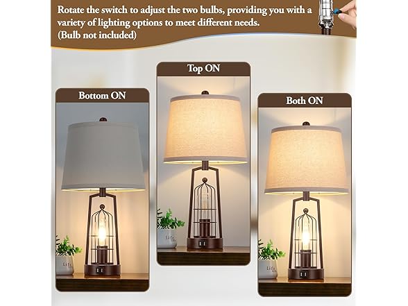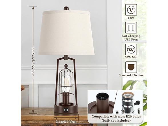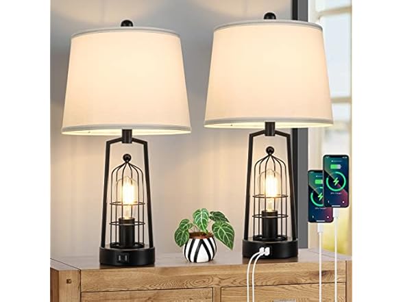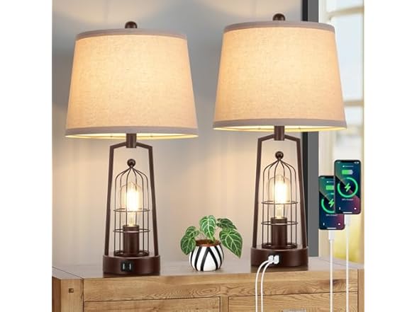 Brightever Farmhouse Table Lamps with 2 USB Ports, Set of 2 Rustic Industrial Desk Lamp for Living Room, 2-Light with Beige Lampshade for Bedside, Bedroom, Nightstand, House Decor, Reading(Bronze)