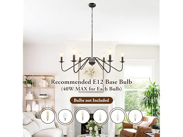 - 【Bulb Base Type】The country style candle chandelier use 6*E12 bulb(Not included). It works with vintage filament, incandescent, LED, and CFL bulbs. Voltage range:110-130V, maximum wattage:40W.