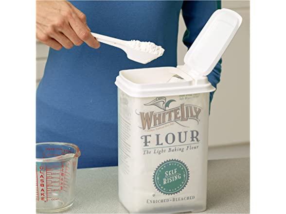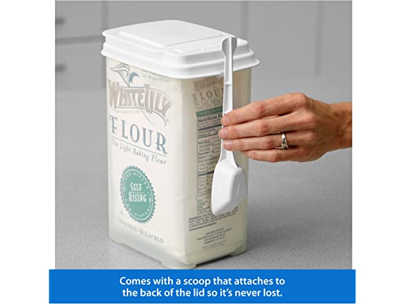 - Container with Spoon - Comes with a long-handled, 2-tbsp scoop, conveniently grips to the holder mounted on the canister and easily reaches into the bottom corners so no flour goes to waste.
