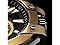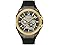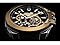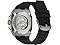 - The multilayered gray dial features luminescent paint on its markers and its skeletonized hands, with gold-tone accents around a 24-hour subdial and a running seconds subdial.