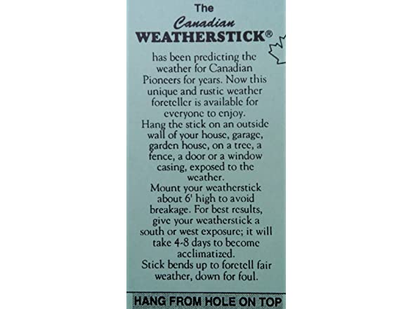 - The Weather Stick is a fun and surprisingly accurate way to predict upcoming weather conditions. The Canadian Weatherstick is an unassuming long birch stick attached to a base. Simply attach it to an outside wall or tree that is exposed to natural elements. The weather stick starts to acclimatize almost immediately to its weather conditions. You will see by the way this weather stick bends, what weather conditions loom ahead. When weather conditions are dry and in good favour, the weather stick points up, but when foul or wet weather threatens, the weatherstick bends down. It is almost never wrong! A great gift for house warmers, cottagers and gardeners alike. Amazing weather predictor comes from the back woods of Northern Ontario. Known around the world because it really works! The Canadian Weather Stick is no fair weather friend and will last for years to come. About 16 inches long.