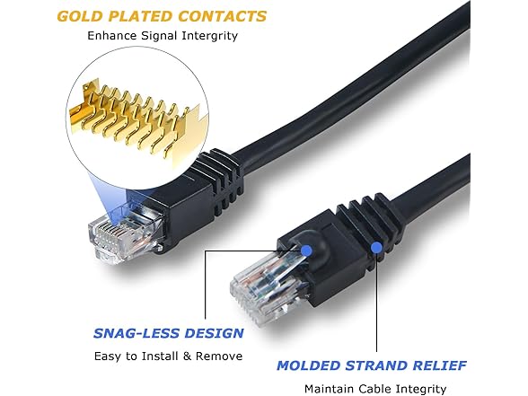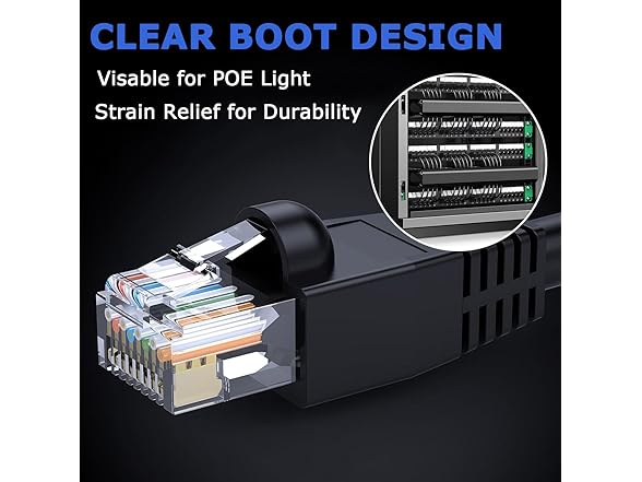 - 【Cat 6 Ethernet Patch Cable With Snagless Design】The RJ45 connectors on this Ethernet cable are wrapped with flexible PVC "snag-less" covers. Snag-less protect the locking connector from wear and tear, not easy to loosen and prevent breakage and make it easier to detach the cable from the Ethernet jack with a simple press of the thumb.