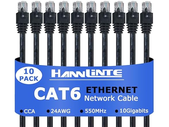 HANNLINTE Cat6 Ethernet Patch Cable 15ft (10 Pack), 24AWG Pure Copper, 10Gbps 550MHZ, Cat 6 Patch Cable for Network Cabinet, Compatible with Computers and Networks - Black 15 Feet