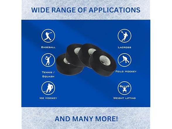 High impact sports tape, 25 yards of quality, durable and easy to use tape per roll (4 pack), that is 100 yards of premium hockey tape. This high quality cloth tape has maximum adhesion and won’t move when exposed to sweat, heat and movement. This ice hockey tape is water proof and will stand up to humidity, rain, heat, sweat and dirt ensuring your protective equipment stays in place and your stick blade is protected. Our tape is easy to secure and remove, it has a slight stretch that will meet the range of motion that high endurance sports require and moisture wicking to ensure maximum longevity, which means you won’t have to change your tape as often. These stick tapes work perfectly on modern composite hockey sticks, traditional wood or fibreglass blades. Professional players wrap the hockey blade and add hockey stick wax to it to increase control and longevity of the tape job. Our tape helps prevent the build up of snow so you have the ultimate control of the puck. Our super high quality tape has no sticky residue and will stick to a magnitude of surfaces being metal, tiles, skin, wood, glass or other smooth surfaces.