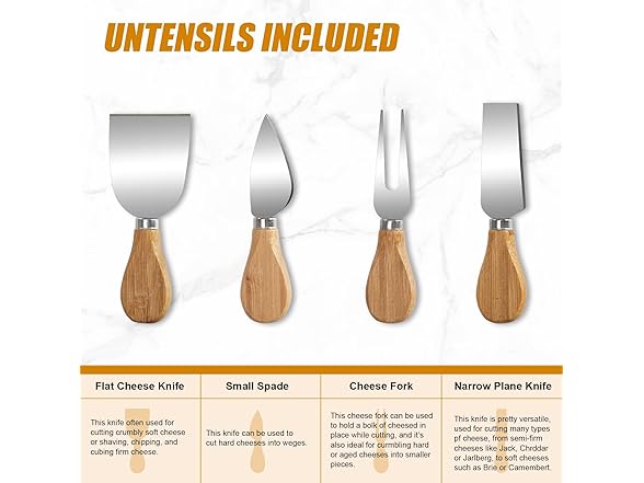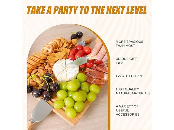 - Fabulous Cheese Board Charcuterie Board: The cheese platter comes with 4 heavy duty stainless steel cheese knives stored in a slide out hidden drawer. 4 non-slip tabs make it easy to hold and prevent the cheese tray from slipping. Be the hero of a festive party by offering your friends beautifully prepared cheese and charcuterie tray.