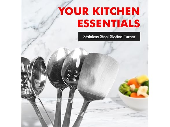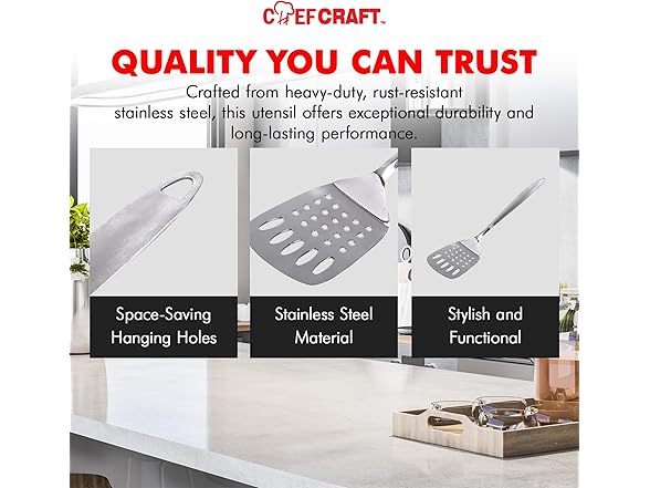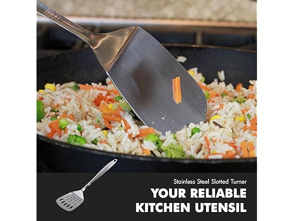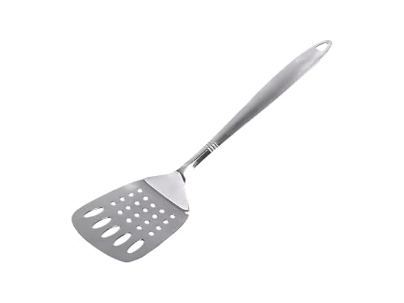 The Chef Craft Stainless Steel Slotted Turner is designed from high quality heavy gauge stainless steel, has a brush finished handle with a hole in the top for easy hanging. The attractive design with a brushed handle and shiny working end is great to use for serving at events and parties. Dishwasher safe for easy, quick, and convenient cleaning after use with any foods.