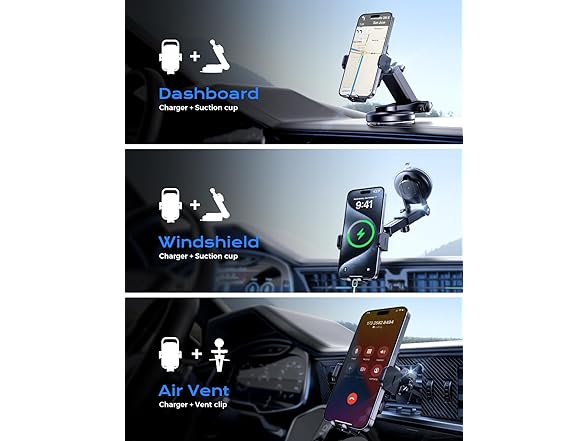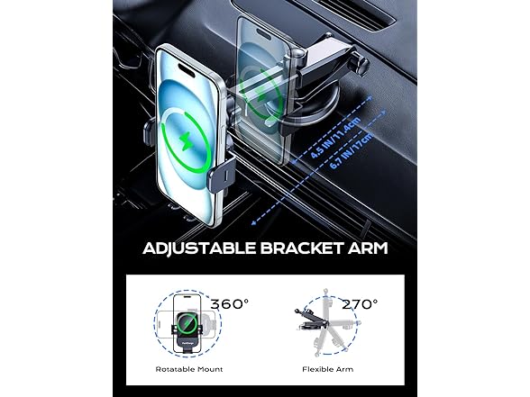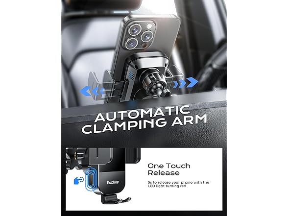 【AUTO CLAMPING FUNCTION & SMART CHARGING】 When connecting to the cable, the car charger mount will automatically clamp when phone is dropped in, make your driving easier and safer. A gentle touch on the 2 sides button of the charger can make the arms open in 3 seconds. When the phone is fully charged, the smart phone mount for car wireless charger will transfer the charging mode to trickle status and protect the battery of your phone