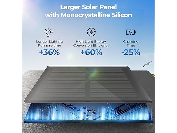 - 【Extra-Large Solar Panel & Extended Runtime】30% Larger Surface Area: Our custom-designed solar panel captures 60% more sunlight than standard models, achieving a 25% conversion rate and 36% longer runtime—even in low-light conditions like cloudy Pacific Northwest days. Lab-tested to charge efficiently at 50% sunlight intensity, perfect for rainy Seattle or foggy San Francisco.