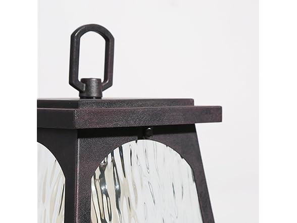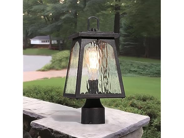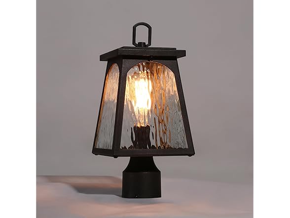 - [Classic Design] Crafted with premium materials, the vintage outdoor post lights feature a trapezoid frame adorned with a textured rust finish, exuding timeless charm. On the top is the O-shaped decorative ring, crowning the light while adding a touch of elegance. Four water ripple glass panels encase the light source, casting a warm and inviting glow.