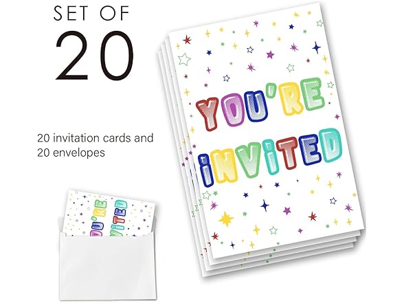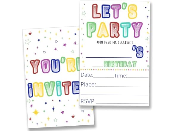 YLKJSTYS Colorful Let's Play Birthday Party Invitations, Teen Boy Girls Birthday Invites (20 Cards with Envelopes) Double Sided Design