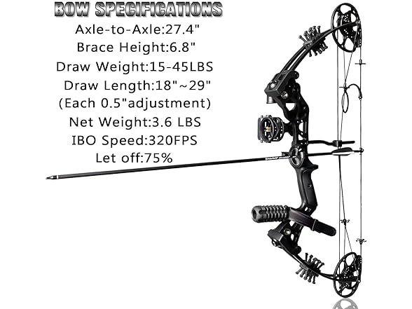 - SPECIFICATIONS: Axle-to-Axle:27.4"; Brace Height:6.8" ;Draw Weight: 15-45LBS; Draw Length:18" ~29" (Each 0.5"adjustment) ;Net Weight:3.6 LBS; IBO Speed:320FPS; Let off:75%