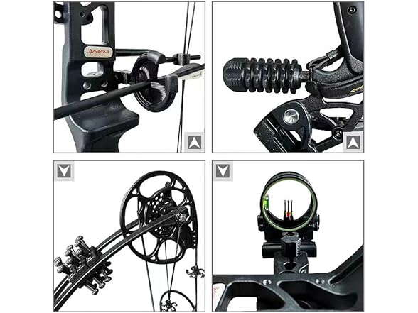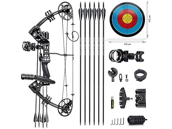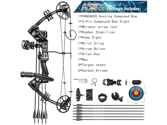 - PACKING LIST: Hunting Compound Bow、3-Pin Compound Bow Sight、Whisker arrow test 、Rubber Stabilizer 、Peep Sight 、Wrist Sling 、Arrow Quiver 、Allen Key、 Wax 、 4xTarget sheet、6xCarbon Arrows