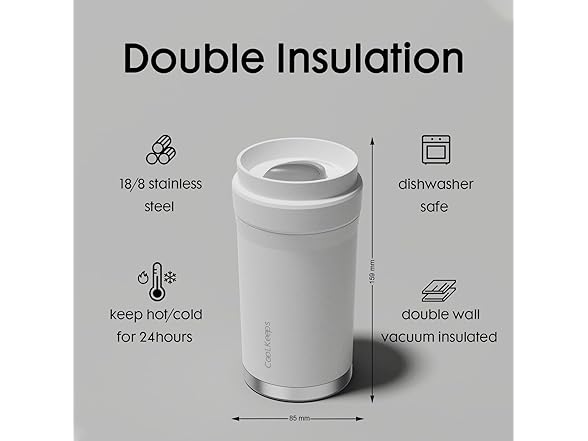 - Vacuum Insulated: Double walled vacuum insulation technology. The vacuum insulated coffee cup keeping your favorite beverages hot for 6+ hours and cold for 12+ hours.