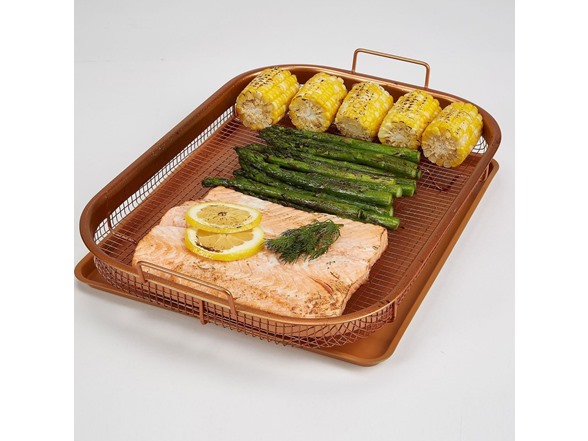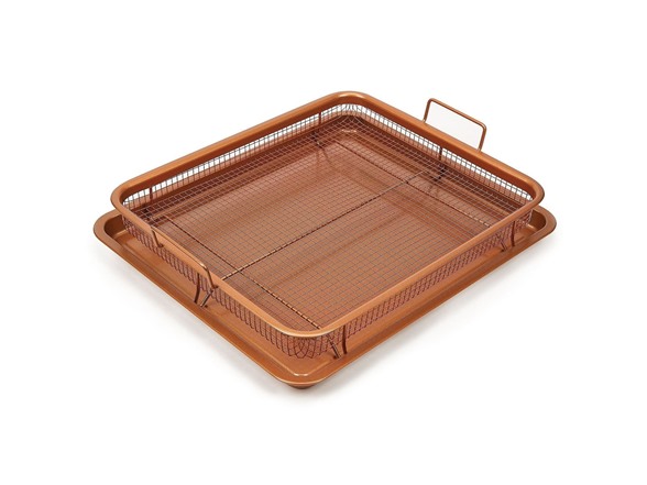 Now it's easier and healthier to enjoy your favorite fried foods. This innovative two-piece set makes French fries, egg rolls or fish right in your oven. No added oil, fat or butter required. The elevated nonstick tray allows super-heated air to pass through and circulate food for the perfect crisp and brown all around. This eliminates the need to turn food. The nonstick cookie sheet catches any crumbs, drips or splatters to keep your oven clean, plus you can use it for baking.