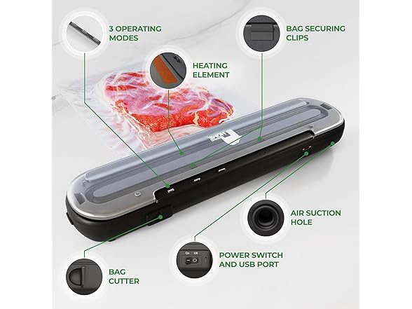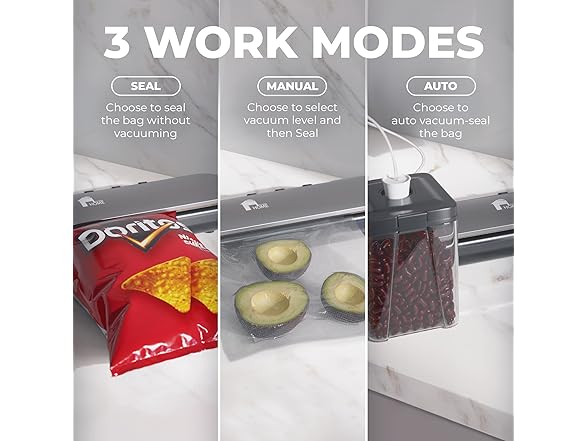 - Customizable Vacuuming Modes - The vacuum food sealer machine features multiple modes(Pulse, Vacuum Seal, and Only Seal). Choose the perfect setting for your food preservation or sous vide needs.