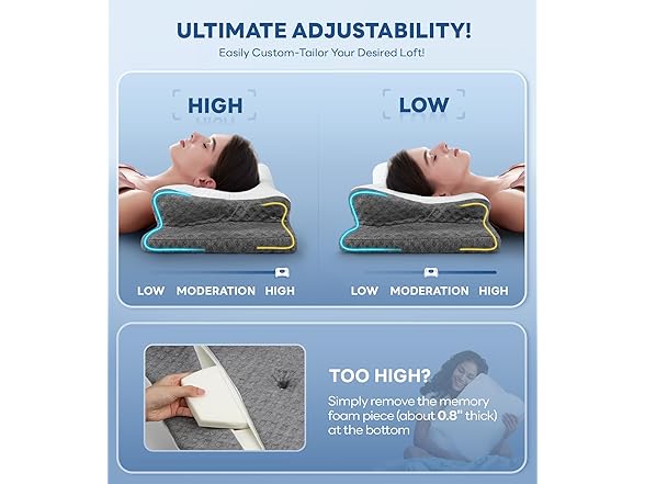 - TAILOR YOUR SLUMBER HEIGHT! Say goodbye to 'one size fits all' with our Cozyplayer Adjustable Memory Foam Pillows for Pain Relief Sleeping. Flip your ergonomic pillow 180 degrees for varied profile heights. Each curve height achieves an ARC neck traction, ensuring open airways and easy breathing for peaceful sleep. Plus, add or remove the 0.8" insert of neck support pillow for height that suits your unique body shape. No need to replace orthopedic shoulder pillows, just customize your sleep!