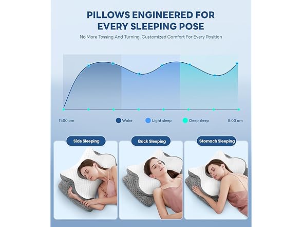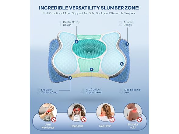 - VERSATILE SLEEP HAVEN! Unveiling 5 dynamic sleep zones which cater to soothe specific pressure points, our cervical pillow ensures comprehensive support no matter how you slumber. Experience profound head wrapping with the innovative hollow perforated design. With an extended armrest area, you're free to position your hands as you please. The butterfly-shaped design supports cozy side sleeping in both directions. A larger side area cradles like a loving embrace. Dive into unparalleled sleep!