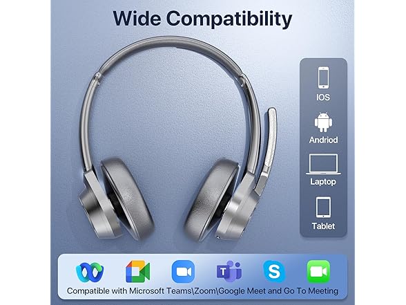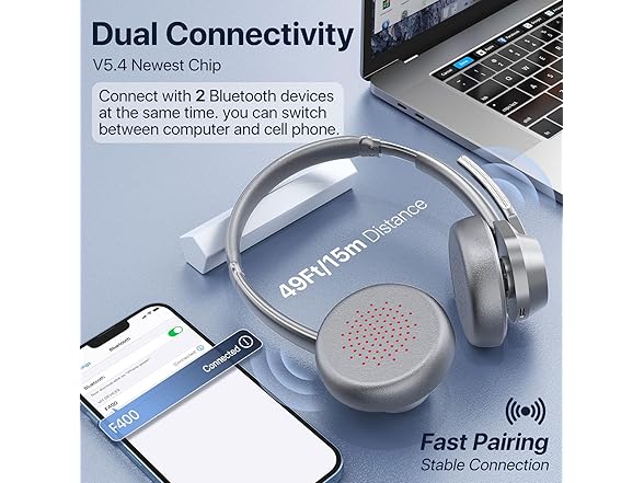 - Seamless Dual-Device Connection - Quickly connect this wireless bluetooth headset to your laptop, Mac, or mobile device via Bluetooth—no extra accessories needed. With Bluetooth multipoint technology, you can connect to two devices simultaneously and seamlessly switch between your laptop and phone, so you won't miss any important connections. The 15m (49 ft) wireless range gives you the freedom to move around your home or office without losing connection.