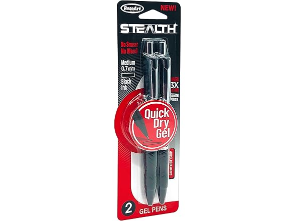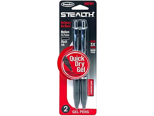 RoseArt Stealth FX Retractable 2ct. gel pen pack comes with 2 black ink pens. This gel pen 2 pack features medium 0.7MM gel pens with plastic barrel and comfort grip. Stealth FX gel pens offer incredibly smooth gel ink that doesn't smear or bleed. Stealth FX gel in dries 3x faster giving you confidence that your work will not smear. Each Stealth FX pen is retractable and comes with a silver clip allowing you to attached your gel pen where ever you need it; to a notebook, folder, even your pocket. Stealth FX gel pens dry so fast, they are great for left hand writers; no more smears or ink on your hand.