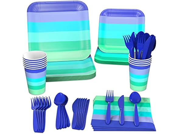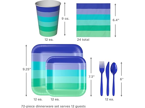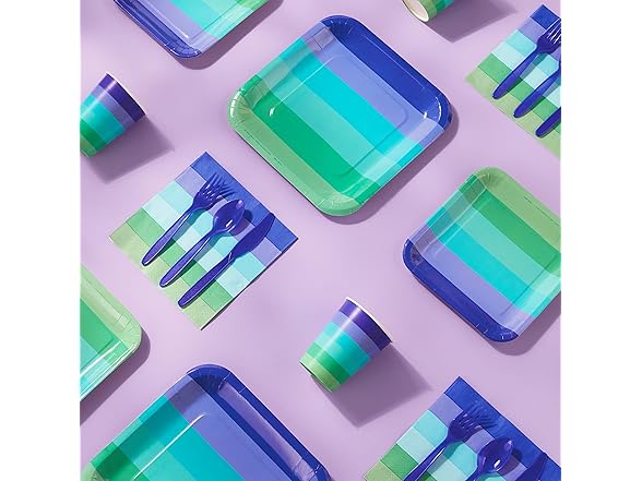 - COOL COLORS: This set of birthday party dinnerware features a gradient of cool rainbow stripes in Indigo Blue, Turquoise, Aquamarine and Sea Green - perfectly curated to impress in person, in photos and on social
